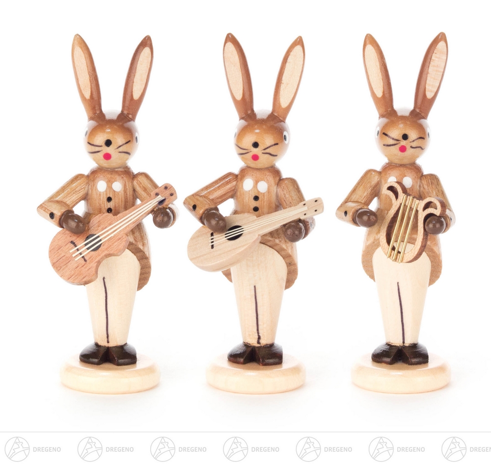 Satz mit 3 musizierenden Hasen aus verschiedenfarbigen Naturhölzern