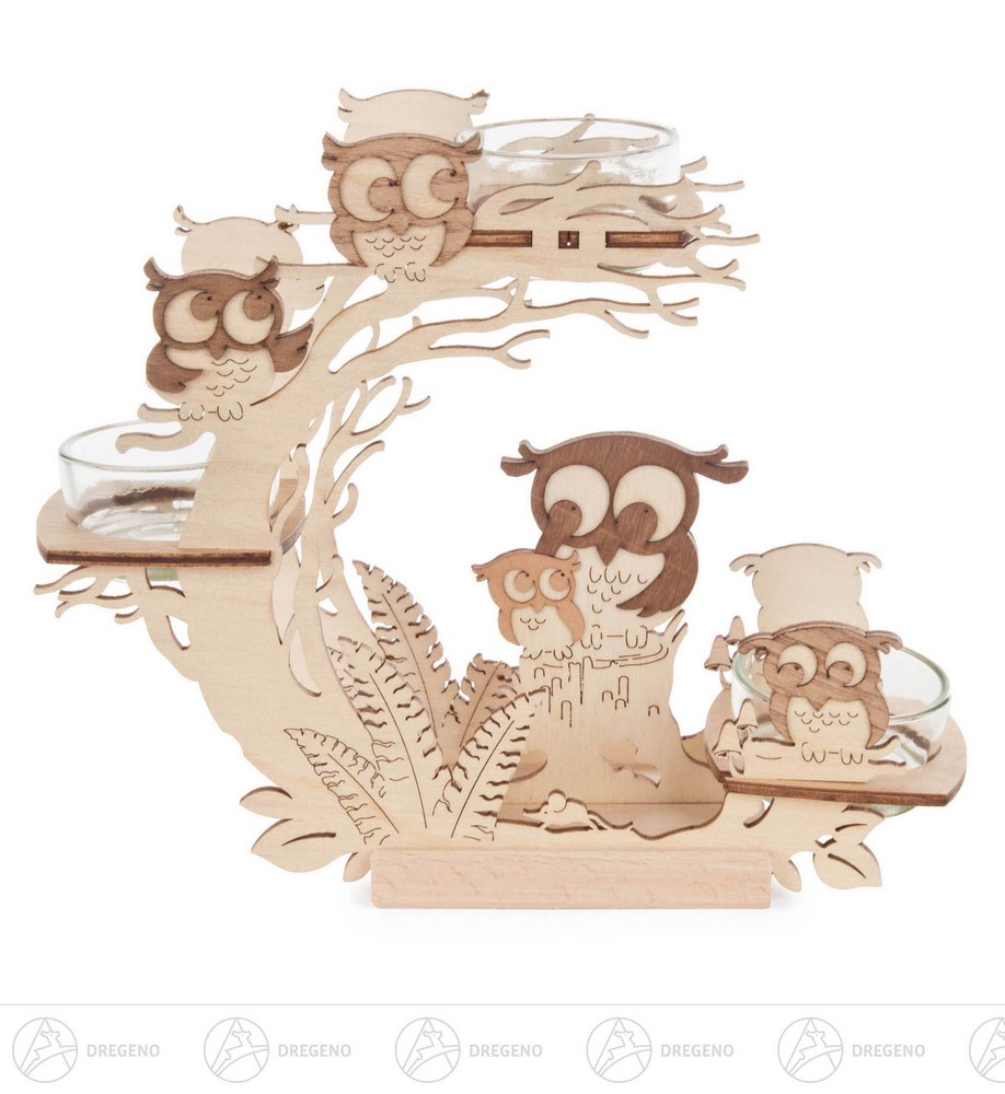Leuchter als Kranz mit Eulen auf Zweigen und Baumstumpf - teilweise mit Edelholz-Furnilux verziert