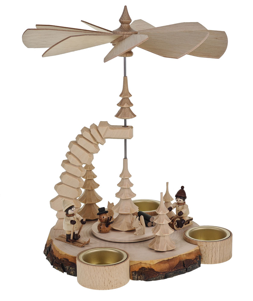 Schlittenfahrer und Skiläufer (Thiel-Figuren) an kleinen geschnitzten Bäumchen auf Sockel - Schneemann, Holzstapel, Eichhörnchen und geschnitzes Reh auf Pyramidenteller