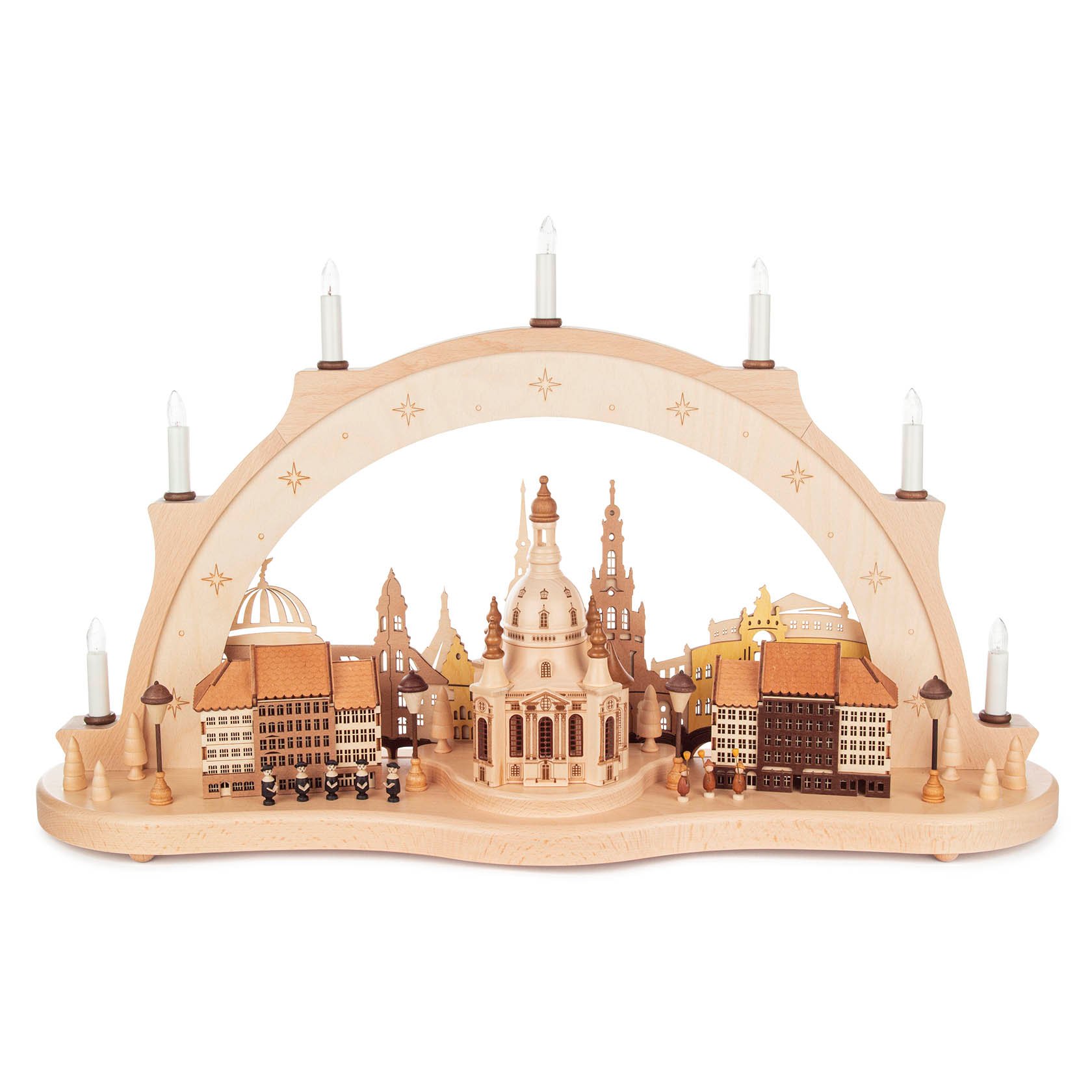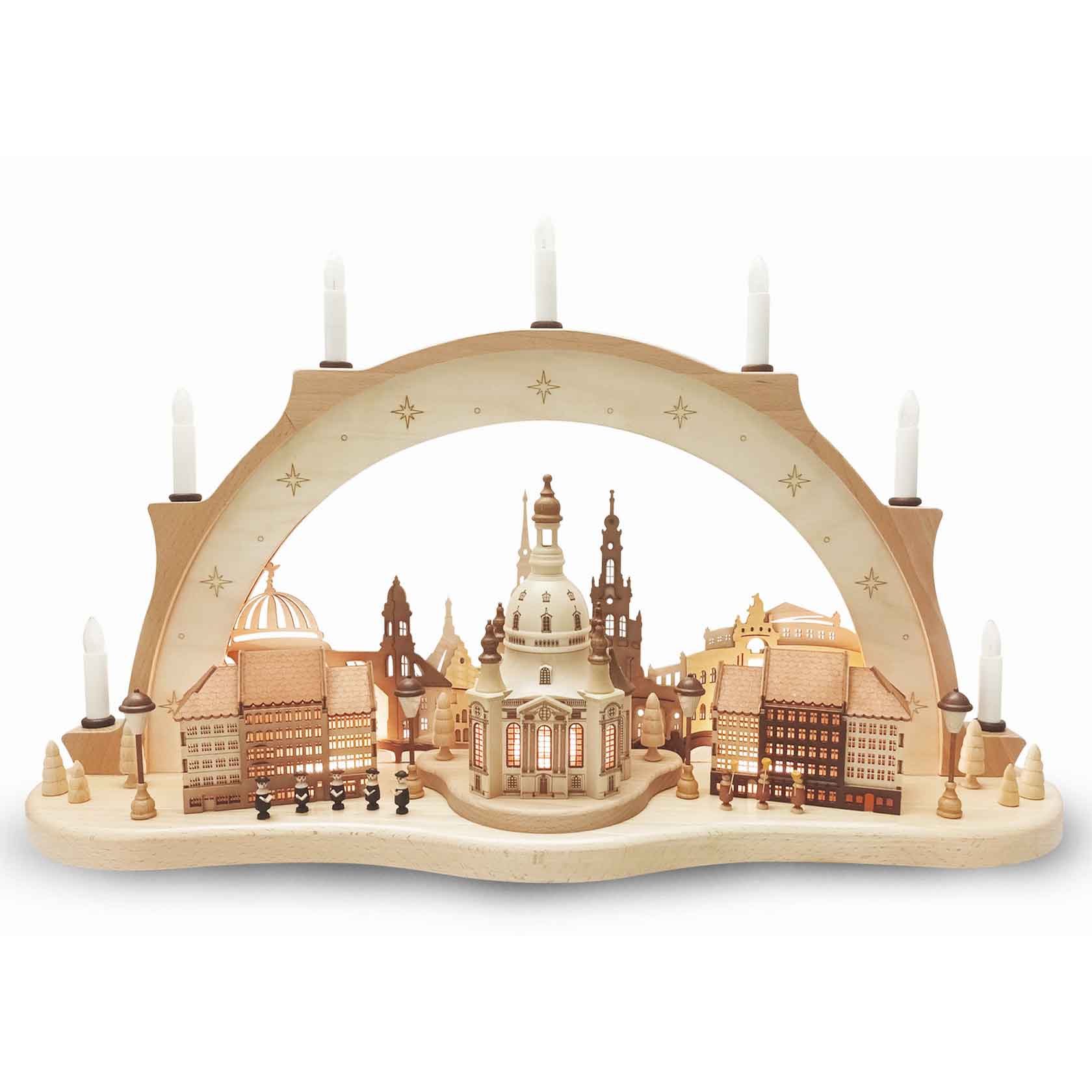 Massivholzschwibbogen aus Buchenholz mit Sperrholzmotivhintergrund Dresdner Frauenkirche auf breitem Sockel