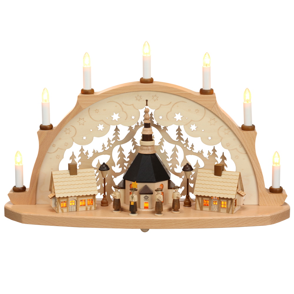 Kurrendensänger vor Seiffener Bergkirche - detailgetreue Fachwerkhäuschen und Straßenlaternen (Kirche und Häuser innenbeleuchetet)
