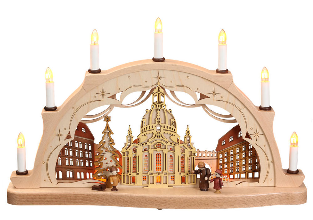 Massivholzschwibbogen aus Buchenholz mit Sperrholzmotivhintergrund Stadt Dresden und Frauenkirche (teilweise farbig abgesetzt), Sternen und Christbaum