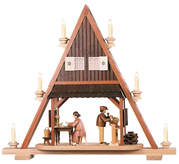 Spielzeugmacher beim Drechseln und Frau am Küchentisch mit Minaturen