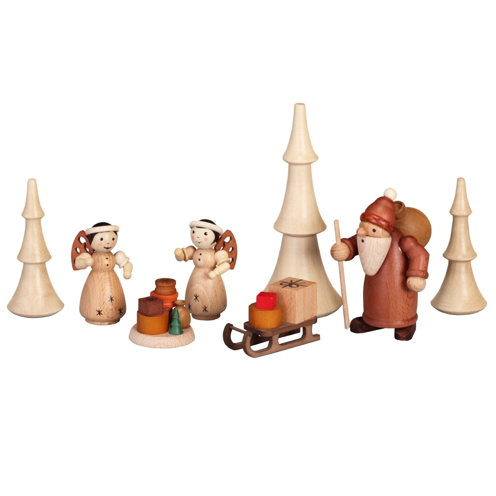mit Weihnachtsmann, Geschenkeschlitten, Geschenken, 3 Bäumchen und 2 Engeln