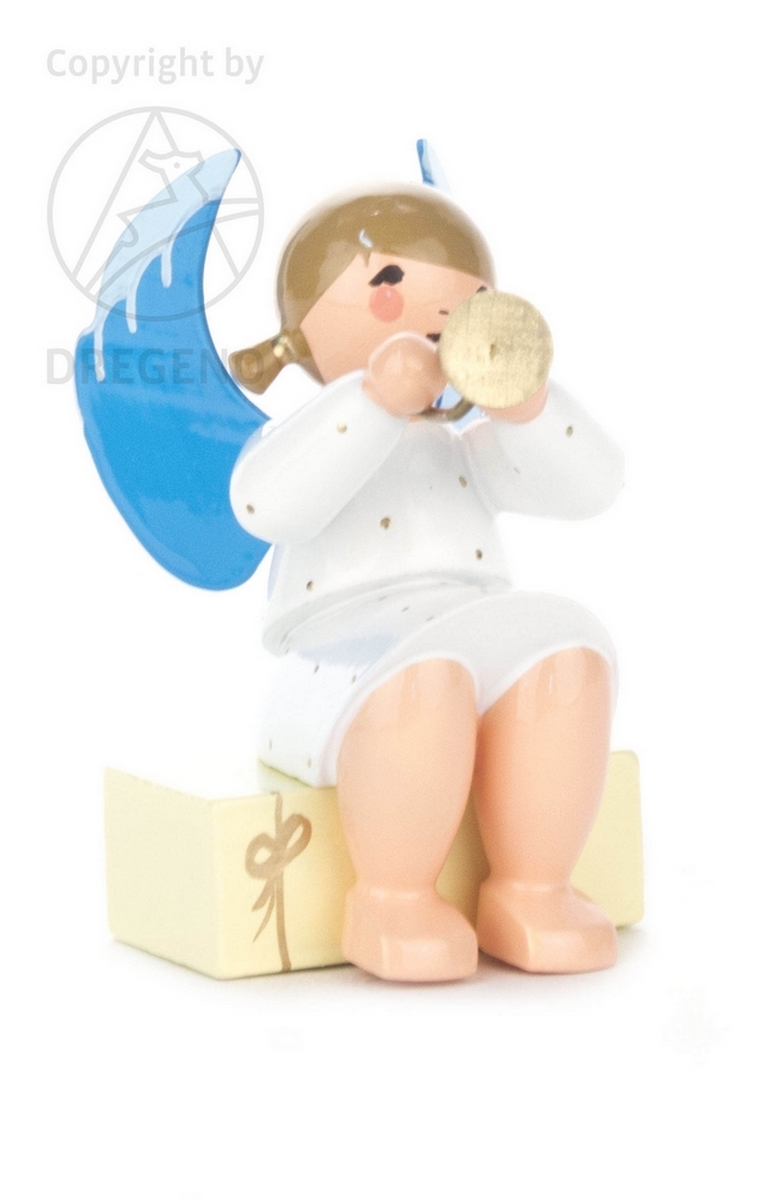 Engel weiß mit Trompete auf Geschenkpaket sitzend (D-225/244)