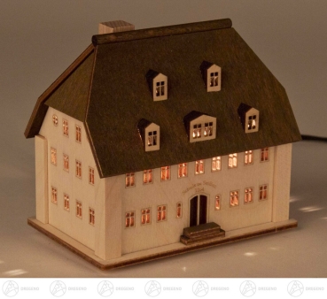 Haus aus Sperrholz mit gelaserten Fenstern und Verzierungen sowie braunem Dach
