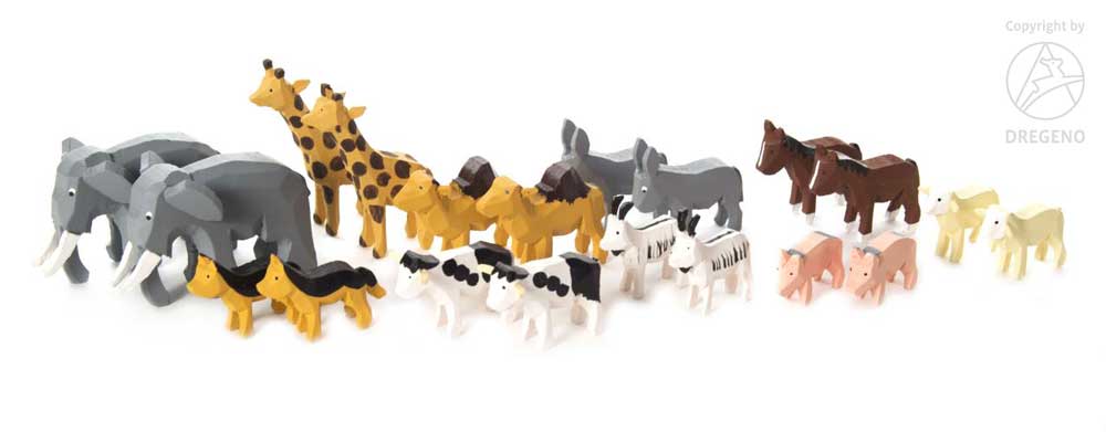 Set mit 20 Tieren (10 Tierpaare) wie z.B. Elefant, Giraffe, Kamel, Esel, Pferd, Hund, Kuh, Ziege, Schwein und Schaf