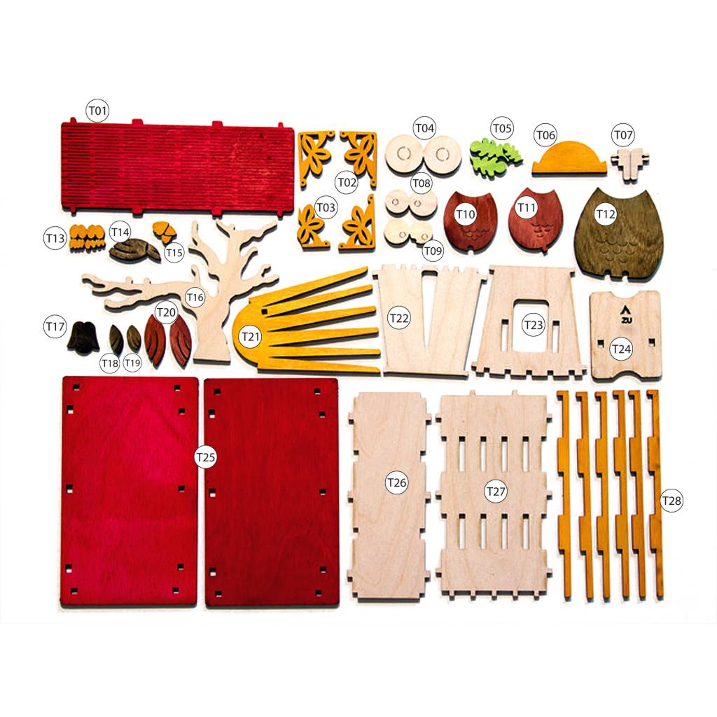 mehrteiliges HOBAKU-Set aus Sperrholz mit Kleinteilen (teilweise farbig gebeizt)