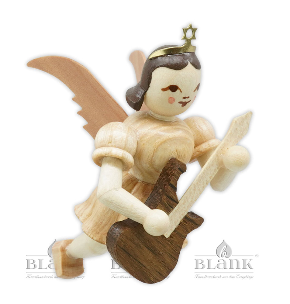 traditioneller und weltbekannter Engel als Baumbehang mit kurzem Faltenrock und Instrument
