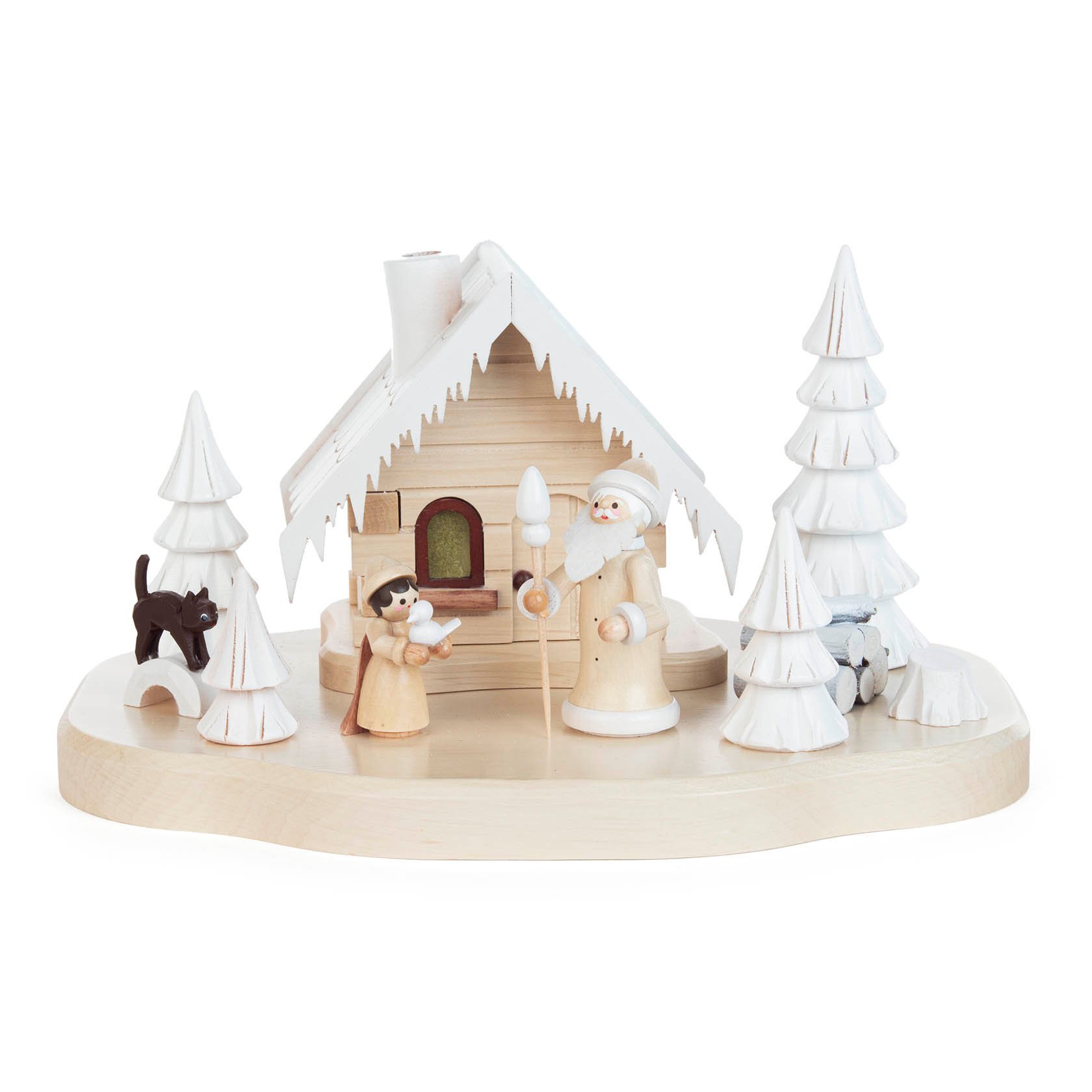 Blockhaus mit Winterlandschaft (natur/weiß) geschnitzten Tannenbäumen, Holzstapel, Katze und Kind mit Vögelchen bei Väterchen Frost (Thiel-Figuren)