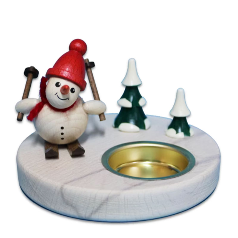 runder Buchenholzsockel weiß lackiert mit lustigem Schneemann neben Bäumchen