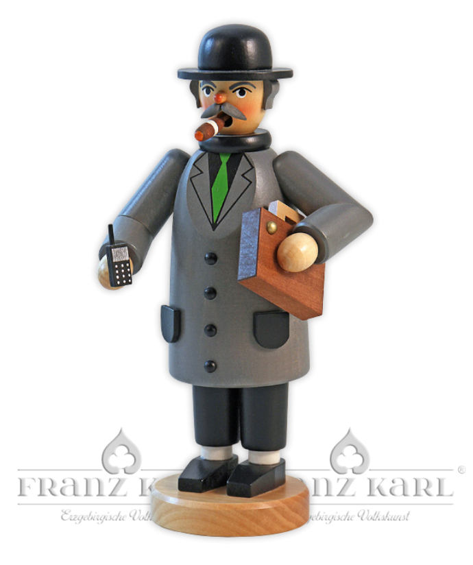 im feinen Anzug mit Krawatte, Hut, Zigarre, Aktentasche und Handy