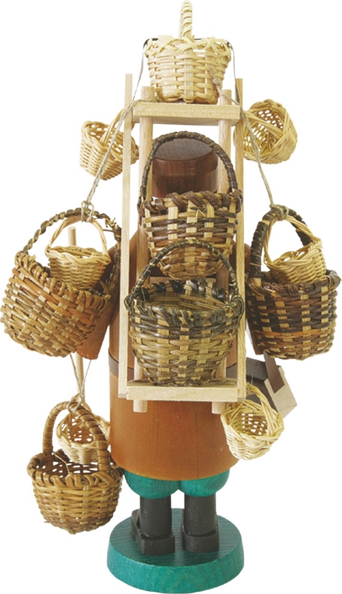 mit über 10 verschiedenen Korbwaren am Rucksack, Pfeife und Stock