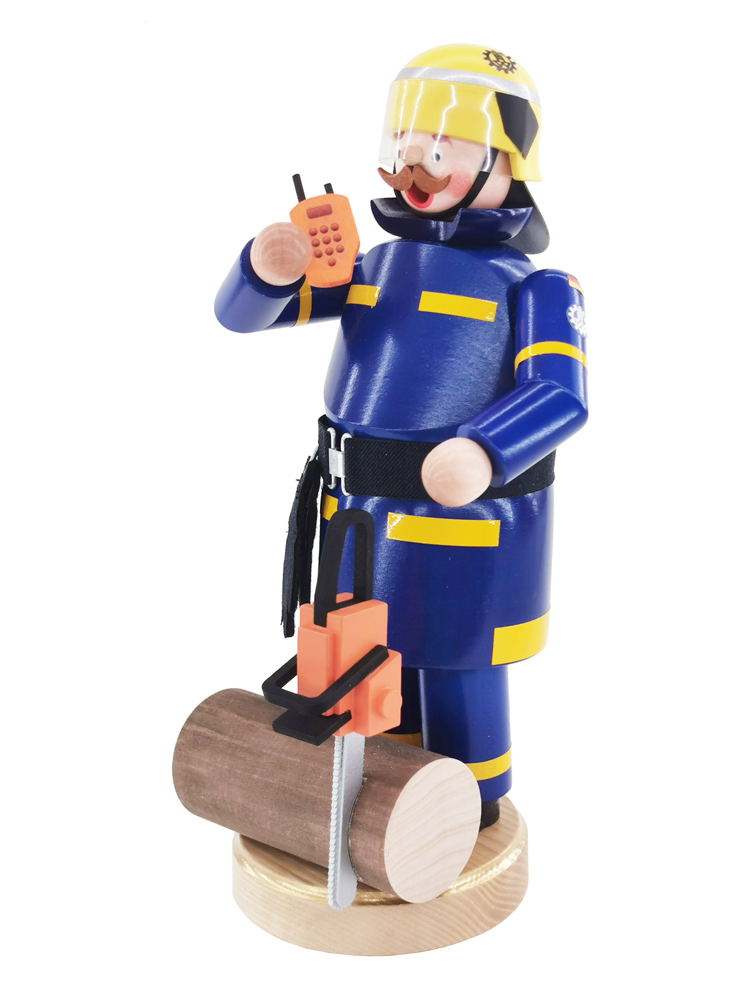 mit typischer Uniform mit Helm, Handschuhe, THW-Logos und Motorsäge in Stamm