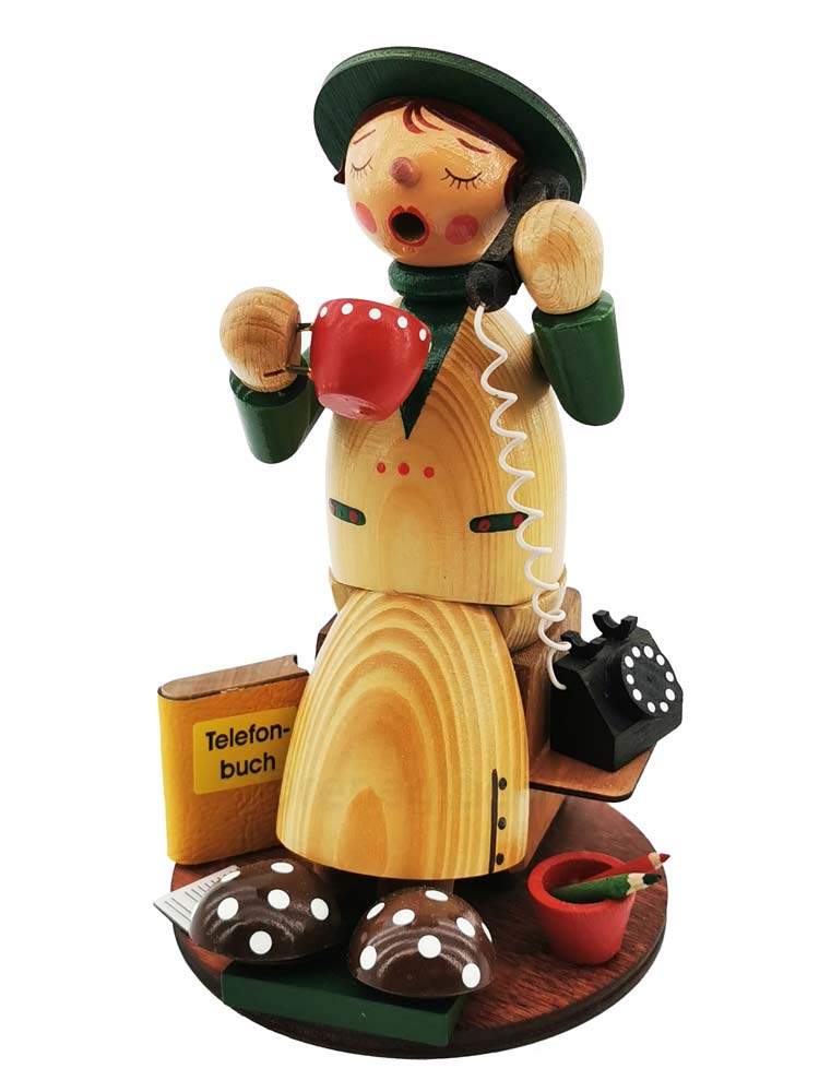 sitzende Räucherfrau am Telefon mit Tasse, Telefonbuch und Pantoffeln