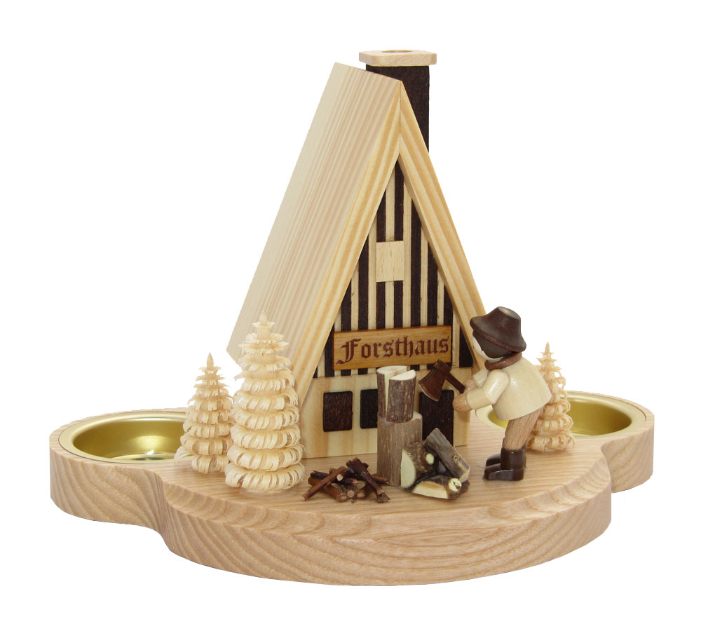 Räucherhaus mit Holzhacker (Figur von Romy Thiel) und Ringelbäumchen
