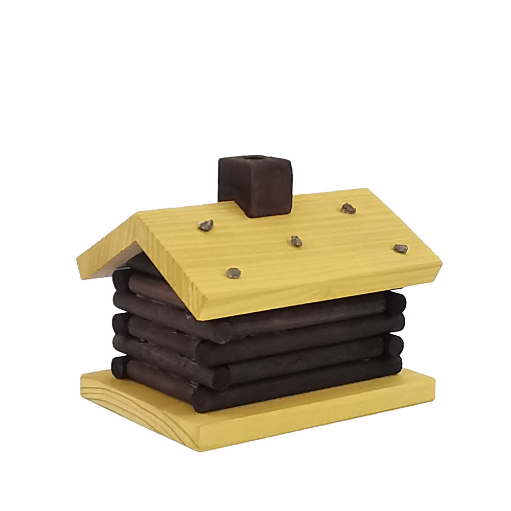 Blockhaus mit gebeizten Stämmen und Steinen auf dem Dach - Dach eichenfarben gebeizt