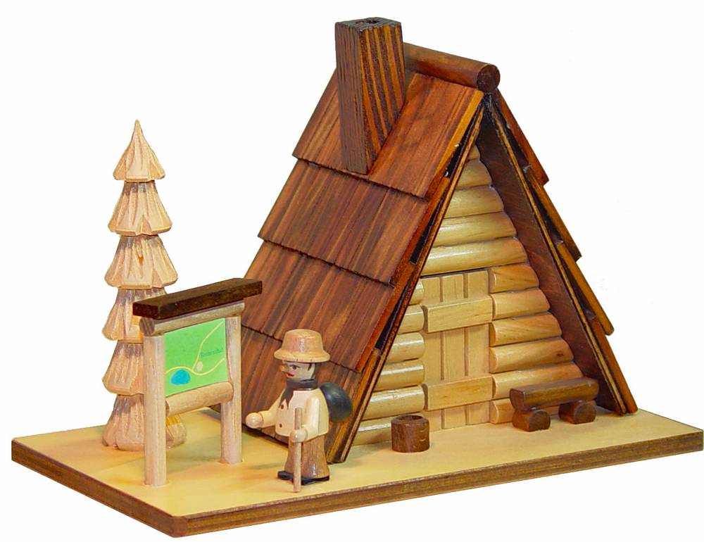 Blockhaus mit Holzschindeldach, Bank, Wanderschild, geschnitztem Baum und Wandersmann (Figur lose & frei aufstellbar)