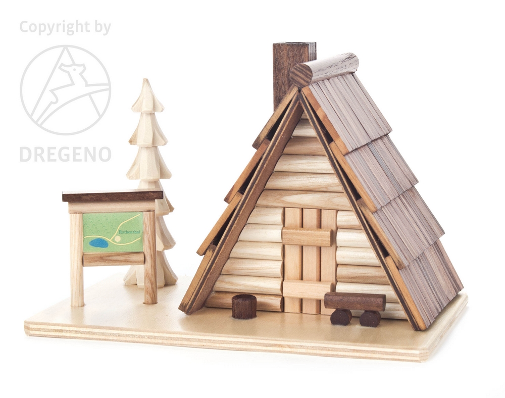 Blockhaus mit Holzschindeldach, Bank, Wanderschild und geschnitztem Baum