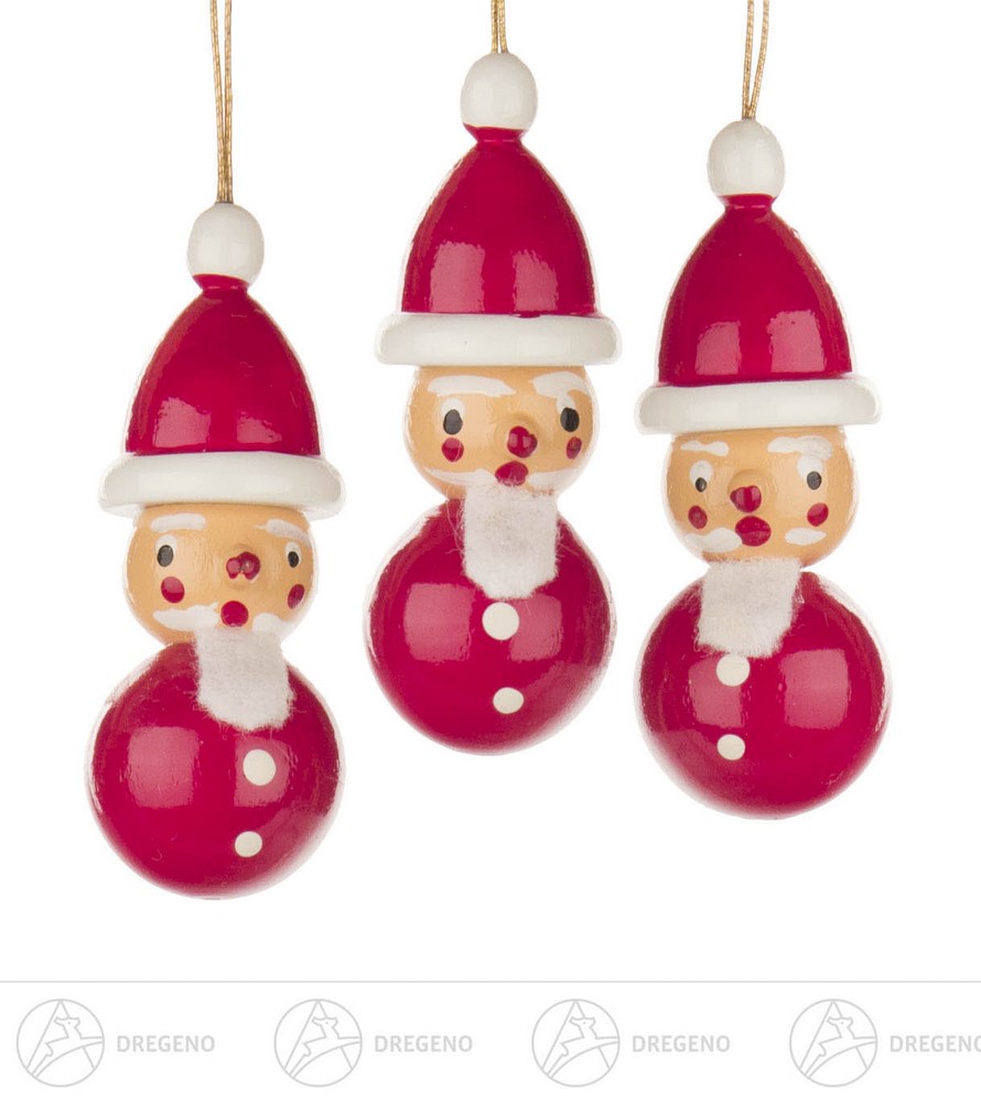 Set aus 3 kleinen von Hand bemalten Weihnachtsmännern am goldfarbenen Faden