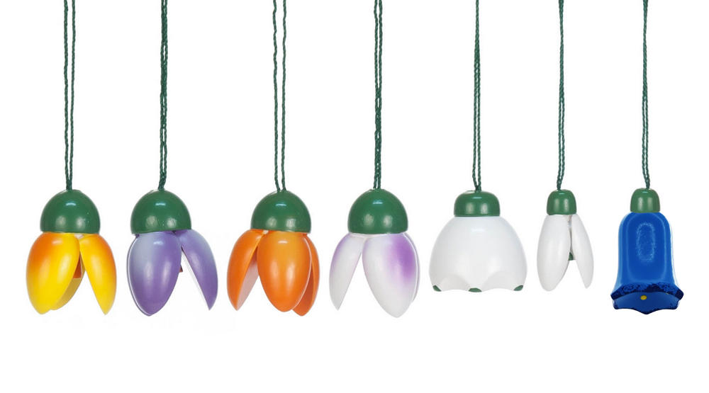 7 teiliges Set aus Blüten von verschieden farbigen Krokusen, Schneeglöckchen, Märzenbecher und Glockenblume